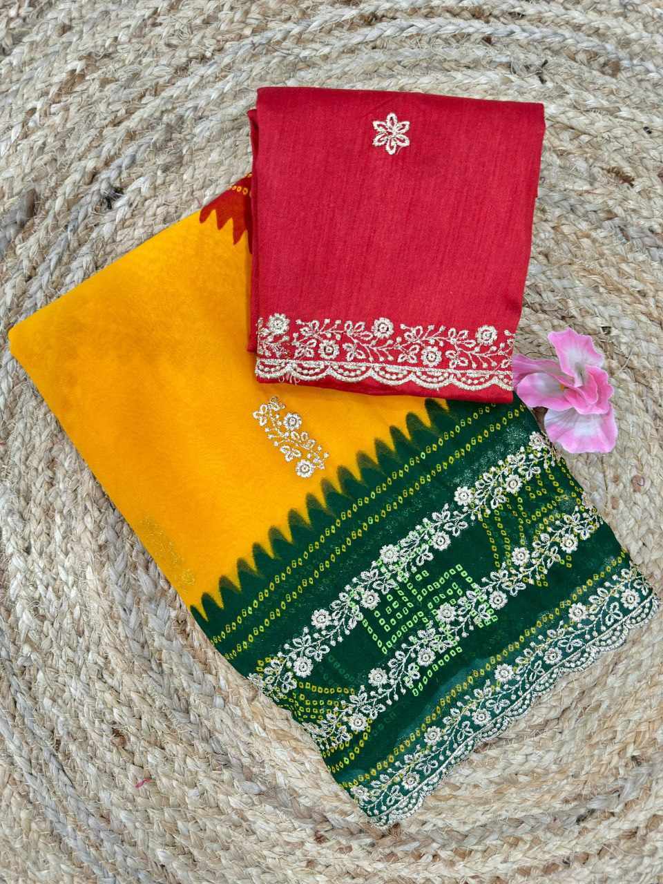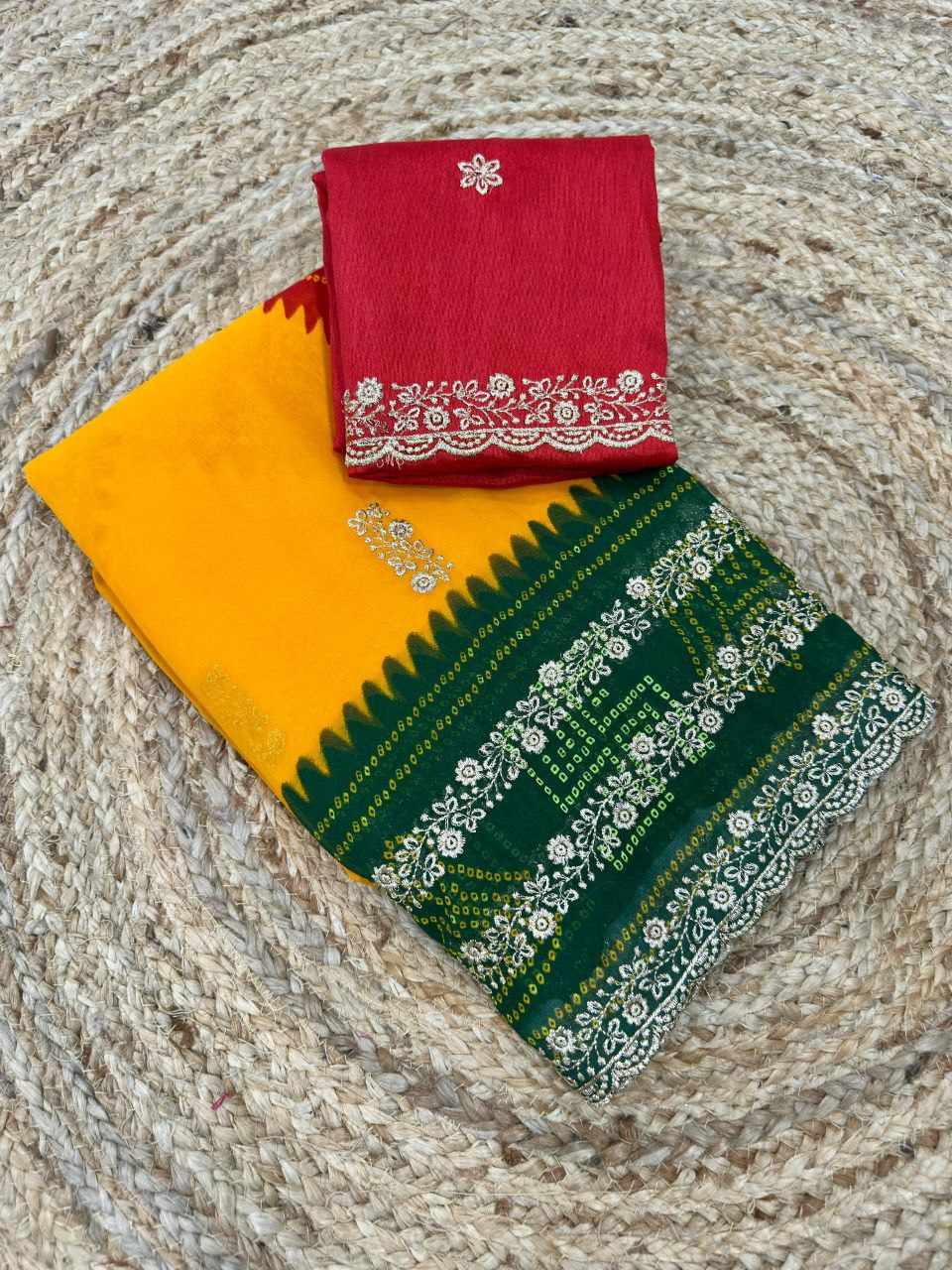 | Name : | PIYU P1052 LEHERIYA BANDHANI-1 Yellow-Green Saree |